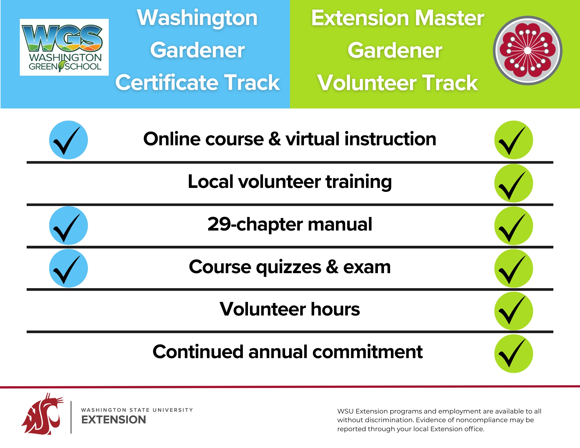 - WSU Extension programs and policies are consistent with federal and state laws and regulations on nondiscrimination regarding race, sex, religion, age, color, creed, national or ethnic origin; physical, mental or sensory disability; marital status, sexual orientation, or status as a Vietnam-era or disabled veteran. Evidence of noncompliance may be reported through your local WSU Extension office.